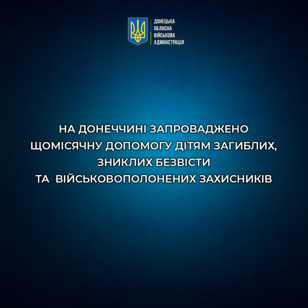 16 лютого набуло чинності розпорядження голови облдержадміністрації від 06.02.2026 № 80/5-26 № «Про затвердження Порядку використання у 2026 році коштів субвенції з обласного бюджету бюджетам територіальних громад Донецької області на надання щомісячної матеріальної допомоги дітям, які мають статус члена сім’ї загиблого(померлого) Захисника чи Захисниці України, військовослужбовців України, захоплених у полон, осіб, зниклих безвісті за особливих обставин під час проходження військової служби, у тому числі ти, які мають задеклароване/зареєстроване місце проживання (перебування) на території Донецької області та перемістилися (евакуювалися) за її межі».