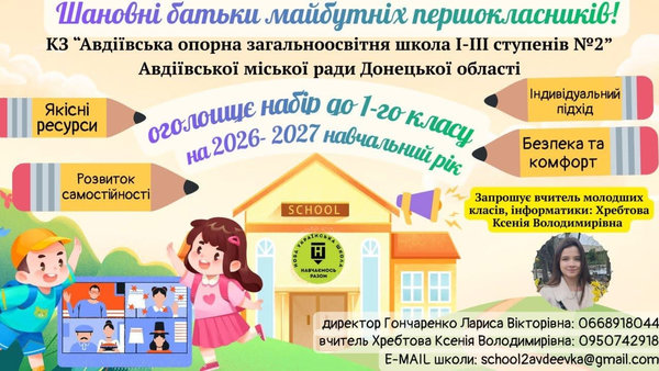 В Авдіївській громаді офіційно розпочато набір першокласників до шкіл № 2 і № 6 на 2026-2027 н.р.