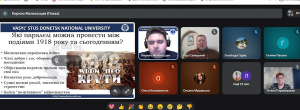Онлайн-круглий стіл «Крути: історичний феномен українського спротиву» організований комунальним закладом «Адміністрація державного історико-архітектурного заповідника у м. Святогірську». Учасників і учасниць круглого столу привітали заступник голови Донецької обласної державної адміністрації Олександр Шевченко і начальник Управління культури і туризму Вікторія Точена.