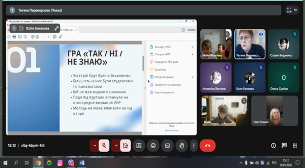 До Дня пам'яті Героїв Крут, 29 січня 2026 року, завідуючою Народним музеєм історії міста Авдіївка - Тетяною Переверзєвою сумісно зі службою у справах дітей Авдіївської міської військової адміністрації була проведена онлайн-зустріч на тему: «Крути: Вибір поколінь».