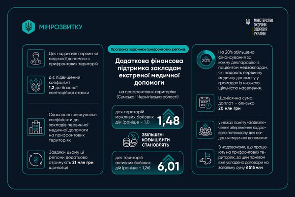 Також фінансову підтримку додатково надають закладам екстреної медичної допомоги на прифронтових територіях (Сумська і Чернігівська області)