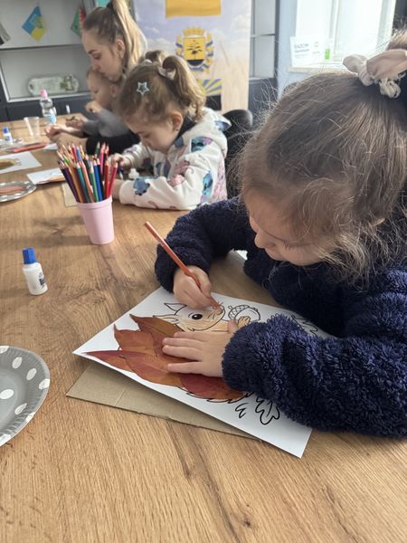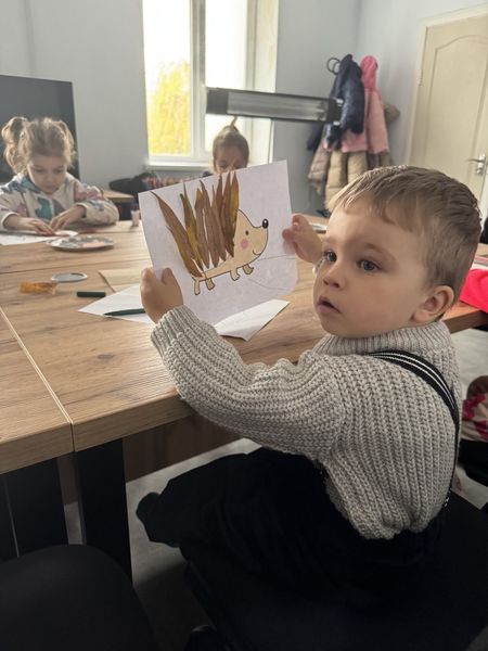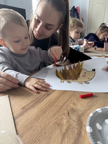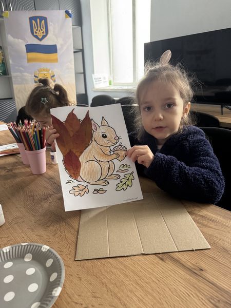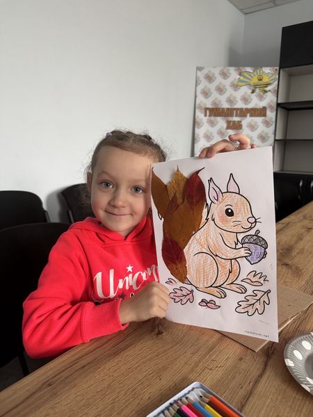 Разом закріпили знання про те, як тварини готуються до зими, а потім створили творчі роботи — малюнки звірят у комбінованій техніці, оздоблені справжніми осінніми листочками.