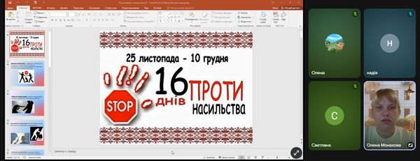 Впродовж акції працівниками Центру було проведено онлайн-захід спрямований на підвищення обізнаності населення щодо проблем виявлення і подолання різних проявів насильства. До заходу були залучені жінки, які є ВПО. Часто саме вони потрапляють в залежні відносини і є жертвами домашнього насильства.