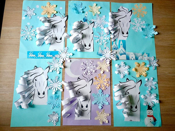 Головним героєм робіт став Кінь — граціозний, сильний і сповнений енергії. Юні майстри створювали аплікації з об’ємними гривами, що додавали руху й динаміки, ніби коні мчать крізь зимову хурделицю.