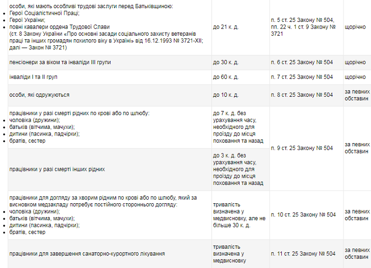 Група 1. Йдеться про підстави для надання відпустки без збереження зарплати, прописані у ст. 25 Закону України «Про відпустки» від 15.11.1996 р. № 504/96-ВР (далі — Закон № 504). У цій нормі чітко визначені категорії працівників, яким може бути надана відпустка «за свій рахунок», або обставини, за яких можливе її оформлення. Тривалість відпустки без збереження зарплати, визначена ст. 25 Закону № 504, різниться залежно від підстави для її надання.