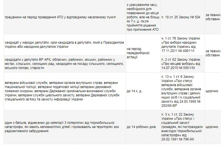 Крім того, Законом України «Про внесення зміни до статті 25 Закону України «Про відпустки» від 15 січня 2015 року № 121-VIII частину першу статті 25 Закону України «Про відпустки» від 15 листопада 1996 року № 504/96-ВР доповнено пунктом 18, відповідно до якого за бажанням працівника в обов’язковому порядку надається відпустка без збереження заробітної плати на період проведення антитерористичної операції (далі — АТО) у відповідному населеному пункті з урахуванням часу, потрібного для повернення до місця роботи, але не більш як сім календарних днів після ухвалення рішення про припинення АТО. Цей закон набув чинності з 1 лютого 2015 року.