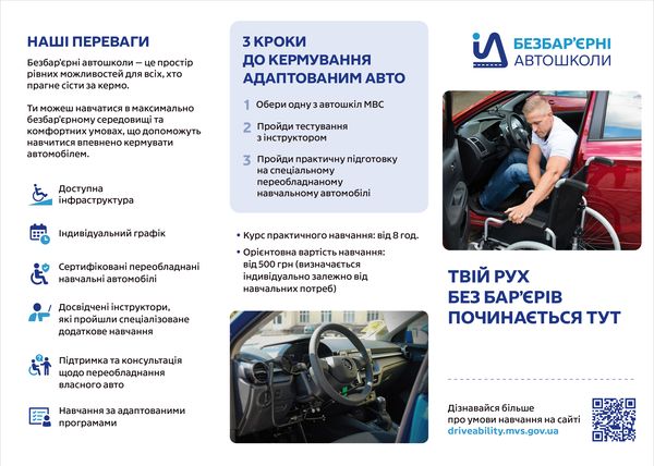 Міністерство внутрішніх справ України в межах ініціативи першої леді України Олени Зеленської «Без бар’єрів» з 2024 року реалізує флагманський проєкт «Автошколи для осіб з інвалідністю».