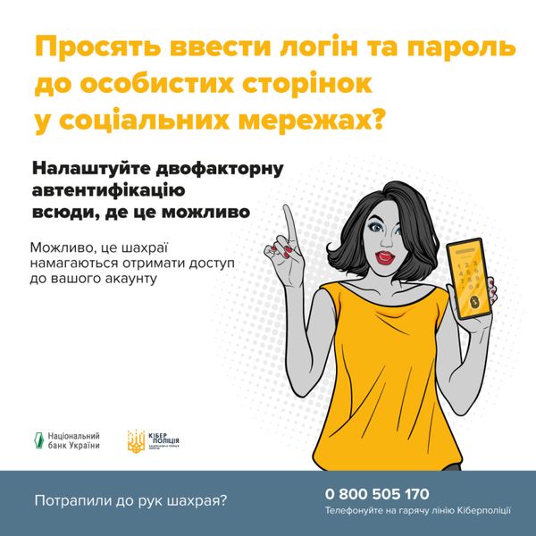 Шахраї зламують облікові записи в соціальних мережах та месенджерах (фейсбук, інстаграм, телеграм, вайбер, сігнал). Для цього поширюють фішингові посилання, наприклад, під виглядом пропозицій взяти участь у голосуванні, конкурсі, пропозицій роботи в інтернеті тощо. Перейшовши за посиланнями, громадяни вводять логіни та паролі від своїх акаунтів у соціальних мережах/месенджерах, які автоматично стають відомі шахраям. Також, щоб виманити паролі до акаунту в інстаграмі, шахраї надсилають фейкове повідомлення від цієї соціальної мережі начебто про отримання блакитного бейджа (верифікацію акаунту).